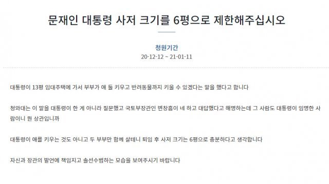 한 청원인은 전날 청와대 국민청원 게시판을 통해 “대통령이 13평(약 44㎡) 임대주택에 가서 부부가 애 둘 키우고 반려동물까지 키울 수 있겠다는 말을 했다고 한다”며 “대통령이 애를 키우는 것도 아니고 부부만 함께 살 테니 퇴임 후 사저 크기는 6평으로 충분하다고 생각한다”고 밝혔다.