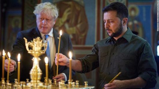 [서울=뉴시스] 볼로디미르 젤렌스키 우크라이나 대통령과 보리스 존슨 영국 총리가 지난 6월17일 우크라이나의 키예프 성 미카엘 성당을 방문한 모습. (사진출처: CNN) 2022.07.10 *재판매 및 DB 금지