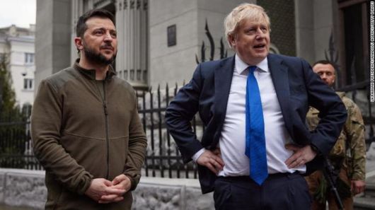 [서울=뉴시스] 보리스 존슨 영국 총리와 볼로디미르 젤렌스키 우크라이나 대통령이 지난 4월9일 우크라이나 키이우에서 열린 회담 중 크레샤티크 거리와 독립광장을 걷고 있는 모습. (사진출처: CNN)2022.07.10 *재판매 및 DB 금지