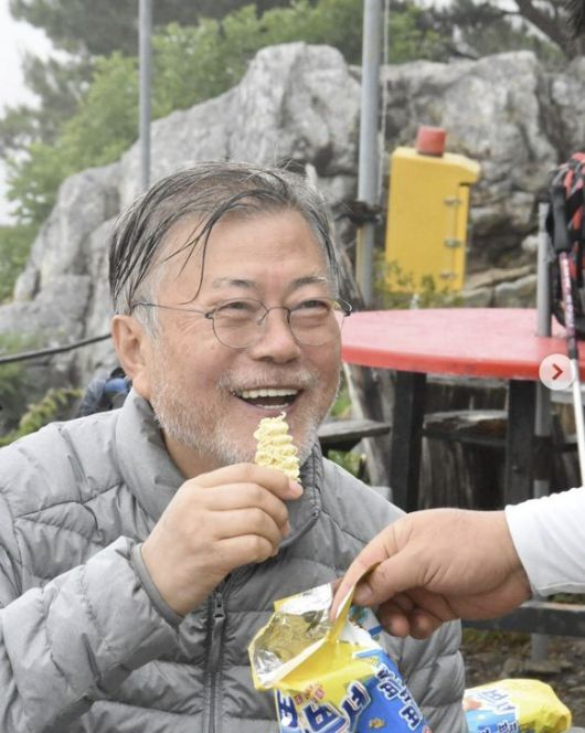 앞서 문 전 대통령은 지난달 24일에도 영축산 등산 사진을 공유한 바 있다. 문 전 대통령은 "네팔 히말라야 아니다. 대한민국 영남알프스 영축산의 취서산장. 어디서든 산행이라면 컵라면은 필수코스"라며 땀에 젖은 채 컵라면을 먹는 사진을 공개했다.