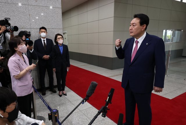 윤석열 대통령이 23일 오전 서울 용산 대통령실 청사로 출근하면서 취재진의 질문에 답하고 있다. 동아일보 DB