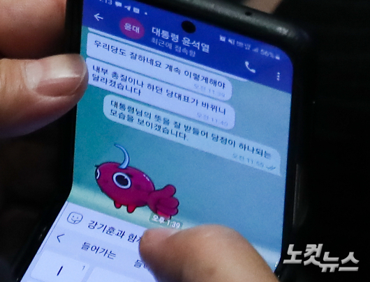 국회 본회의장에서 열린 제 398회 임시회 6차 본회의 대정부 질문도중 권성동 국민의힘 당대표 직무대행 겸 원내대표가 윤석열 대통령과 텔레그램 메시지를 주고 받았다. 권 대표의 휴대전화에는 '대통령 윤석열'이라는 발신자 명의로 "우리당도 잘하네요. 계속 이렇게 해야", "내부 총질이나 하던 당대표가 바뀌니 달라졌습니다"라는 내용의 메시지가 왔다. 권 대표는 이에 "대통령님의 뜻을 잘 받들어 당정이 하나되는 모습을 보이겠습니다"라고 답장을 보냈다. 대통령이 집권여당 대표를 비판한 내용이 담긴 메시지가 고스란히 언론사 카메라에 포착된 것은 전례를 찾아보기 힘들어 파장이 만만치 않다. 권 대표는 이날 자신의 페이스북에 글을 올려 "이유를 막론하고 당원동지들과 국민들께 심려를 끼쳐드려 죄송하다"고 밝혔다. 박종민 기자