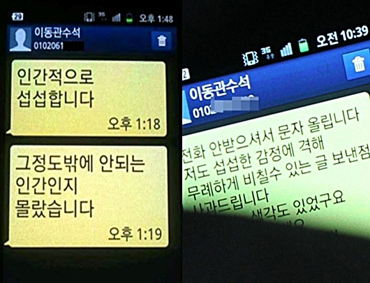 '이명박의 입'으로 통하는 이동관 청와대 언론특보가 민주당 박지원 의원에게 '막말 문자메시지'(왼쪽)를 보내 논란이 되자 다음날 '사과 문자'를 보냈다. 박 의원은 대검찰청 국감에서 로비스트 박태규씨가 이 특보를 비롯한 여권 실세와 자주 만났다고 주장했고, 이에 이 특보로부터 받은 문자를 공개하며 "청와대가 얼마나 국회를 경시한 것인지 보여준다"고 비난했다. 이후 이 특보는 해명자료를 내고 문자 속 '인간'은 자신을 지칭한 것이라고 해명한 바 있다. 박지원 의원실 제공·연합뉴스