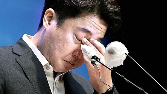 이준석 국민의힘 대표가 지난 13일 서울 여의도 국회 소통관에서 열린 기자회견에서 눈물을 흘리고 있다. 이 대표는 당 중앙윤리위원회로부터 당원권 정지 6개월 중징계를 받은 이후 36일만인 이날 처음으로 공식 석상에 모습을 드러냈다. 뉴스1