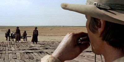 한 시골 기차역에 세 명의 무법자가 들이 닥치면서 영화는 시작됩니다. 이들은 악당 프랭크(헨리 폰다)를 만나러 오는 이름 모를 한 남자, 하모니카(찰스 브론슨)를 기다리는 중입니다. 결국 그들은 맞닥뜨리게 되고 세 무법자는 하모니카의 총에 쓰러지고 맙니다.