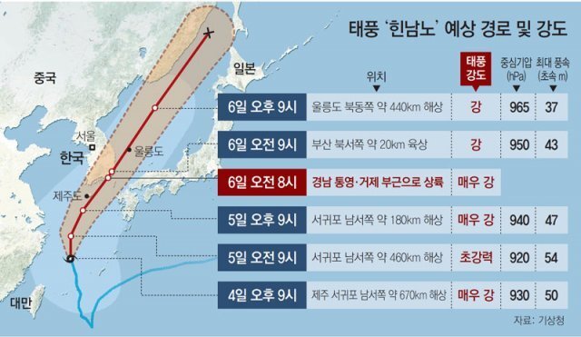 힌남노는 이후 ‘매우 강’ 상태로 6일 오전 8시경 경남 통영과 거제 부근에 상륙할 것으로 보인다. ‘매우 강’ 단계 역시 사람이나 커다란 돌이 날아갈 정도의 거센 바람이 분다. 기상청 관계자는 “(힌남노 경로에) 변동성이 있다. 현재 예측 경로보다 더 서쪽으로 진행해 국내 영향이 예상보다 더 커질 수 있다”고 말했다.
