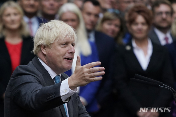 [런던=AP/뉴시스] 보리스 존슨 영국 총리가 6일(현지시간) 런던의 다우닝가에서 퇴임 연설을 하고 있다. 존슨 총리는 자신을 '역할을 완수한 부스터 로켓'으로 비유하며 "트러스 신임 총리가 위기를 극복하기 위해 할 수 있는 모든 일을 할 것"이라고 말했다. 보수당 신임 대표 겸 총리 당선인인 리즈 트러스 외무부 장관은 이날 오후 총리에 취임한다. 2022.09.06.