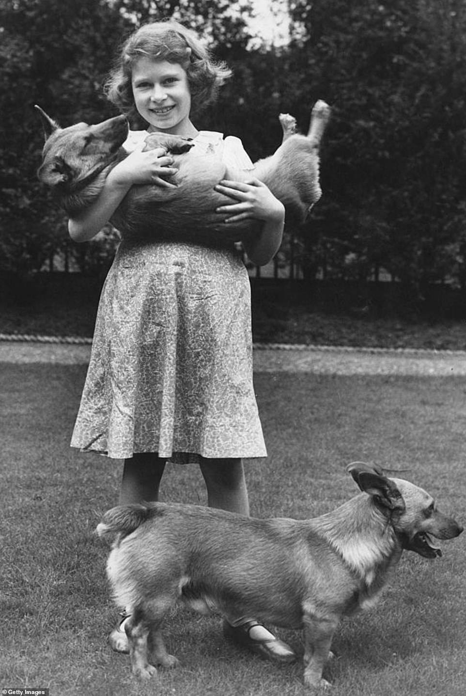 Her Majesty is pictured holding a corgi in the grounds of Windsor Castle, Berkshire, Great Britain, 30 May 1944 - shortly after her 18th birthday