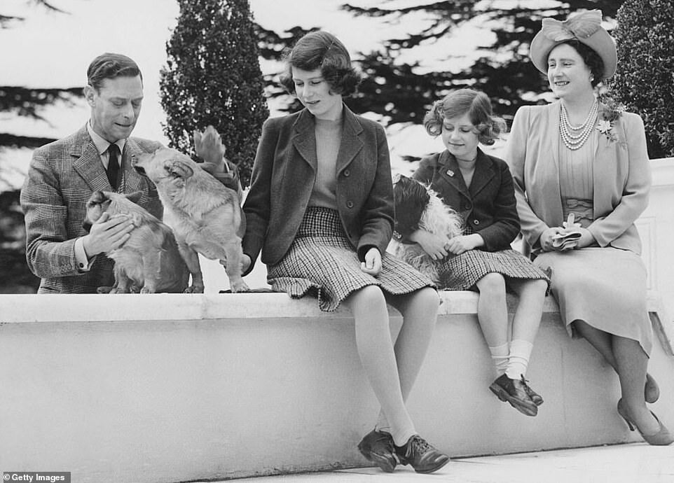 Animals were a key part of the Queen's early life - she kept corgis until her death. The Royal family are seen the Royal Lodge in Windsor. (From right to left) Queen Elizabeth (1900 - 2002), Princess Margaret (1930 - 2002), Princess Elizabeth and King George VI (1895 - 1952) with the family dogs Ching