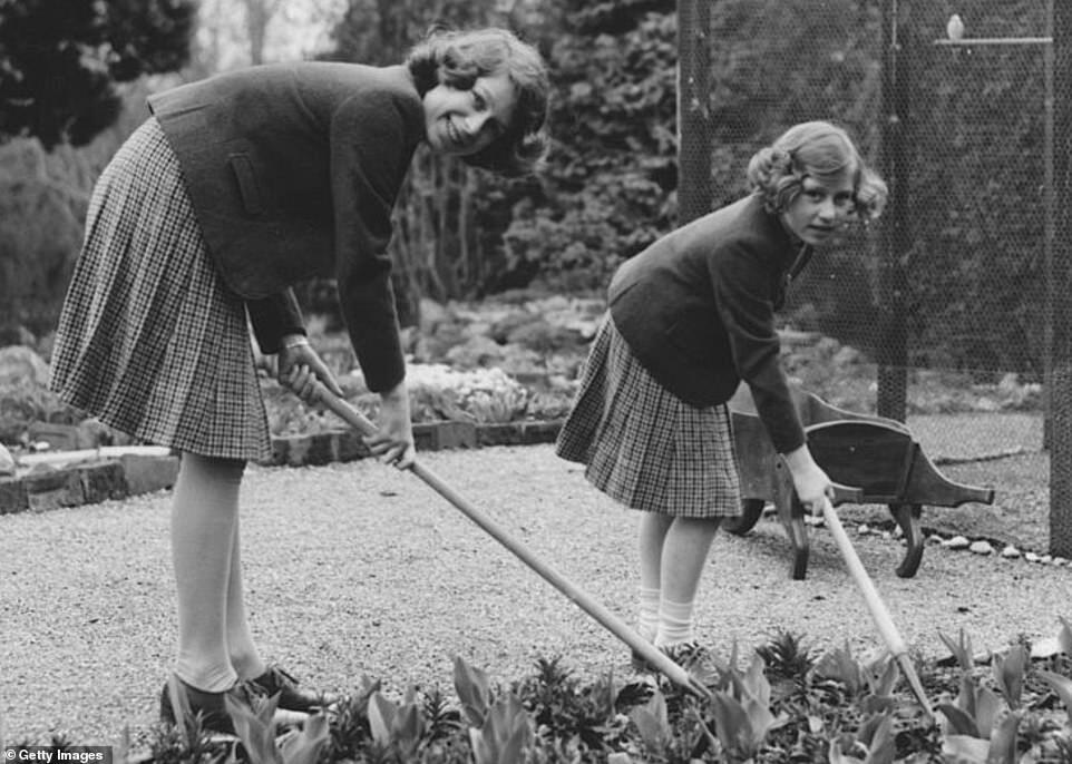 Elizabeth II (left), as Princess Elizabeth, and her younger sister Princess Margaret working in the garden at Royal Lodge, Windsor, which they created and look after themselves in April 1940
