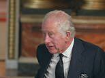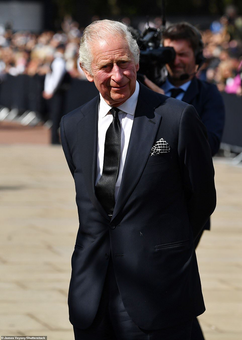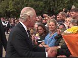 King Charles III went to Buckingham Palace to meet fellow mourners this afternoon where he shook hands and accepted their condolences to cries of 'God save the King' and impromptu renditions of the national anthem. One woman kissed him on the cheek. He also inspected flowers and tributes left for his late mother at the gates before entering the palace.