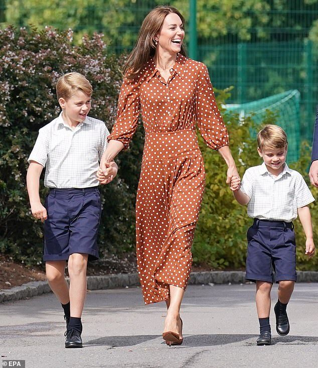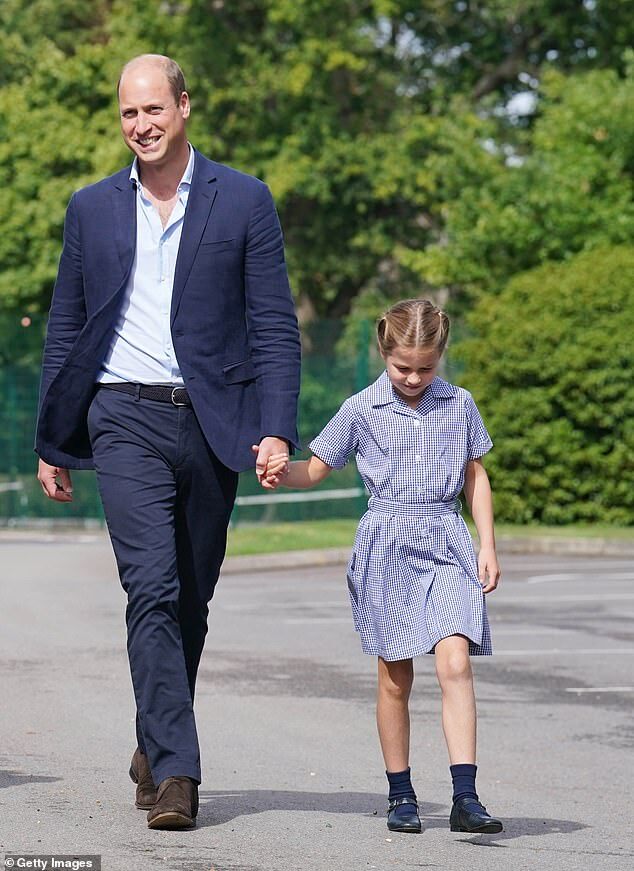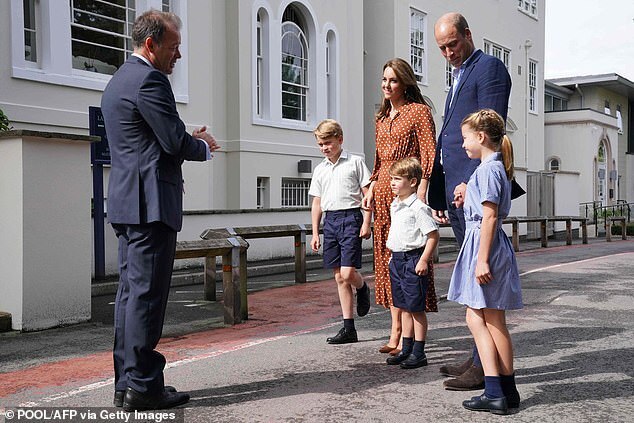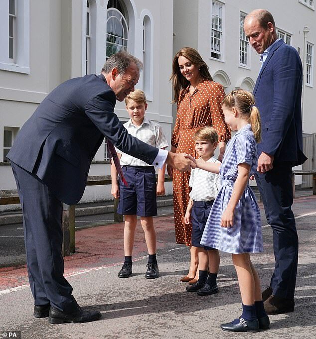 The Duke and Duchess of Cambridge's children have new title as their grandfather becomes king and will be known as Prince George of Wales, Princess Charlotte of Wales and Prince Louis of Wales (pictured on their first day of school, Wednesday morning)