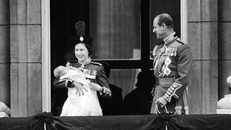 Queen Elizabeth II holds up 12-week-old son Prince Edward to the crowds gathered outside Buckingham Palace in London, June 13, 1964. (Source: Associated Press)