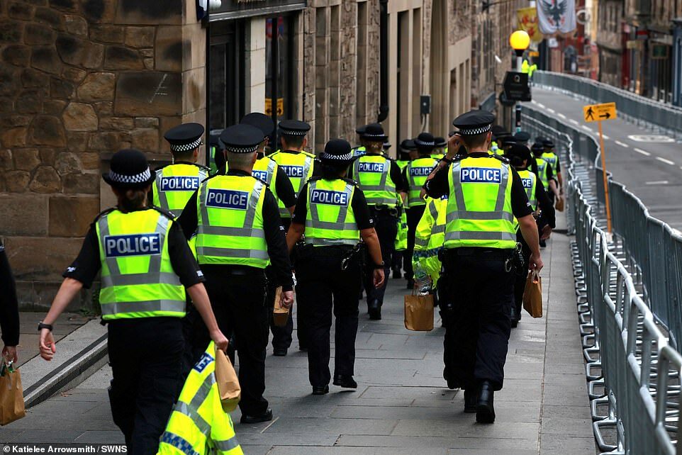 Police prepare the streets on the Royal Mile in Edinburgh on Sunday, ahead of the arrival of the coffin of Her Majesty, Queen Elizabeth II