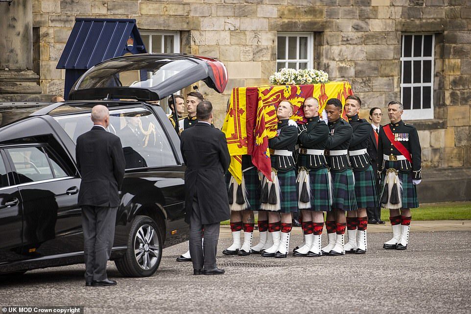 The Queen's funeral will be held on Monday, September 19, after 10 days of national mourning. Pictured is her cortege arriving at Holyroodhouse in Edinburgh today