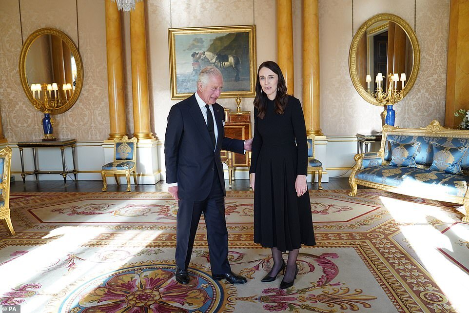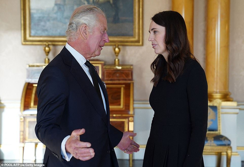 New Zealand's Prime Minister was seen clutching Charles's hand as they met this afternoon, pictured