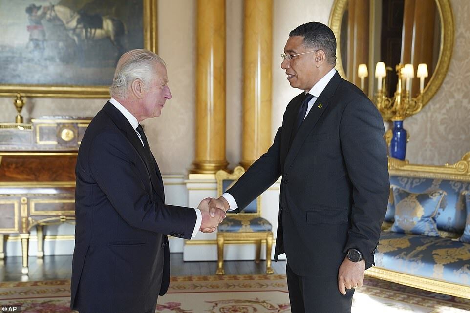 Britain's King Charles III speaks with Prime Minister of Jamaica Andrew Holness