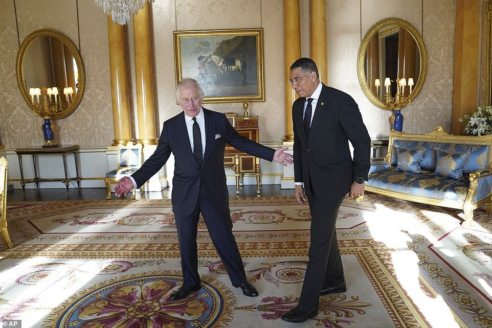 Britain's King Charles III speaks with Prime Minister of Jamaica Andrew Holness this afternoon