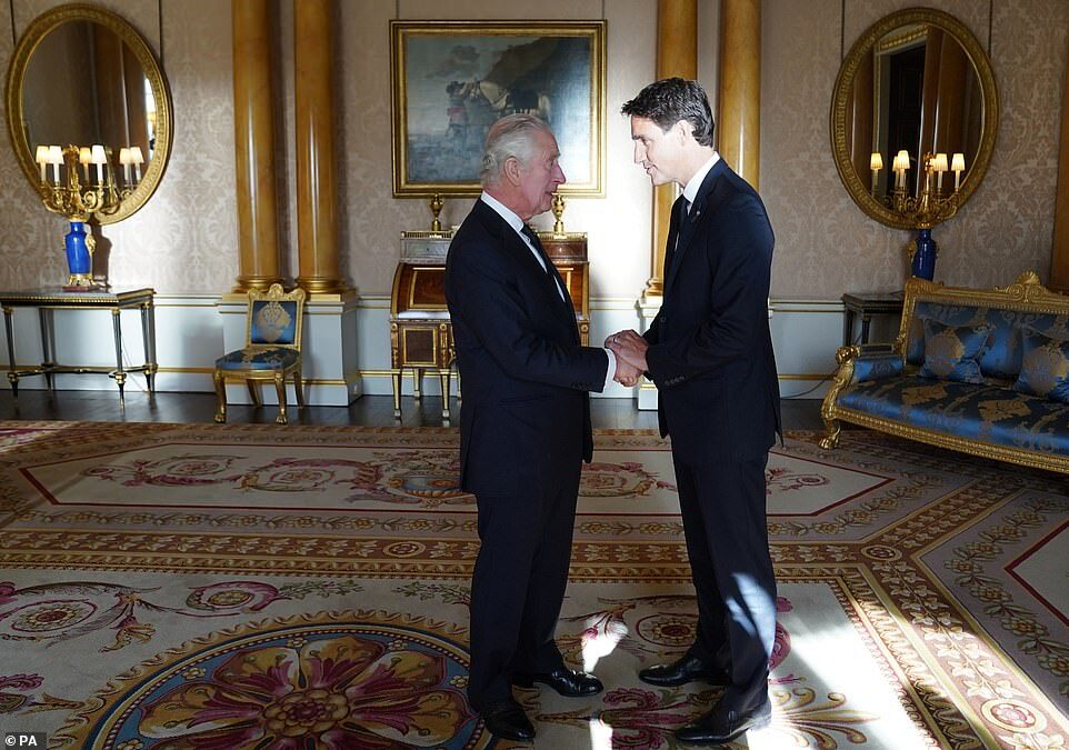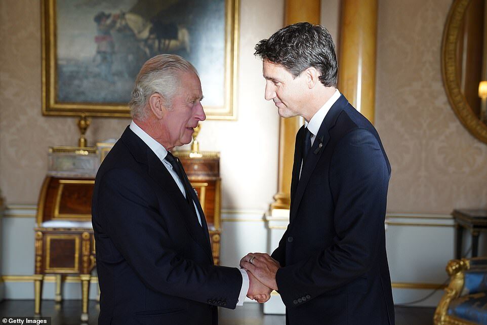 King Charles III shakes hands with Prime Minister of Canada, Justin Trudeau