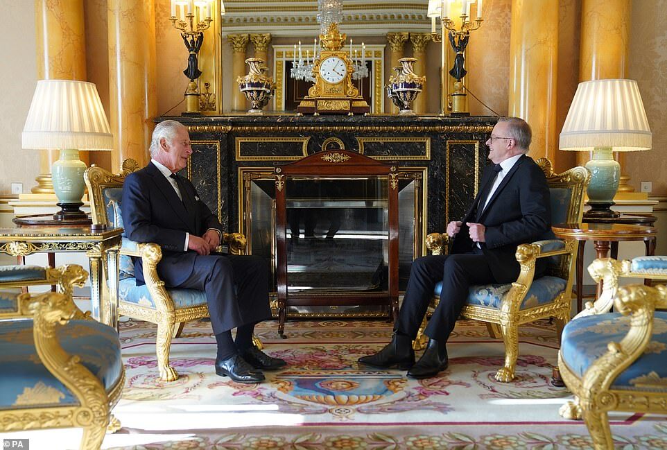King Charles III sits with Prime Minister of Australia, Anthony Albanese