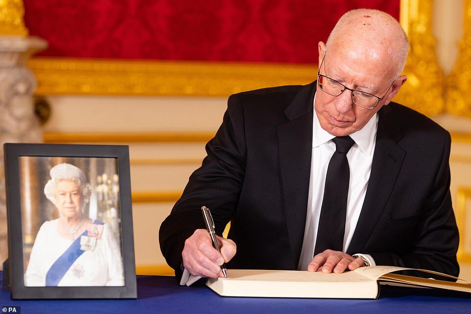 David Hurley Governor-General of Australia signs a book of condolence at Lancaster House