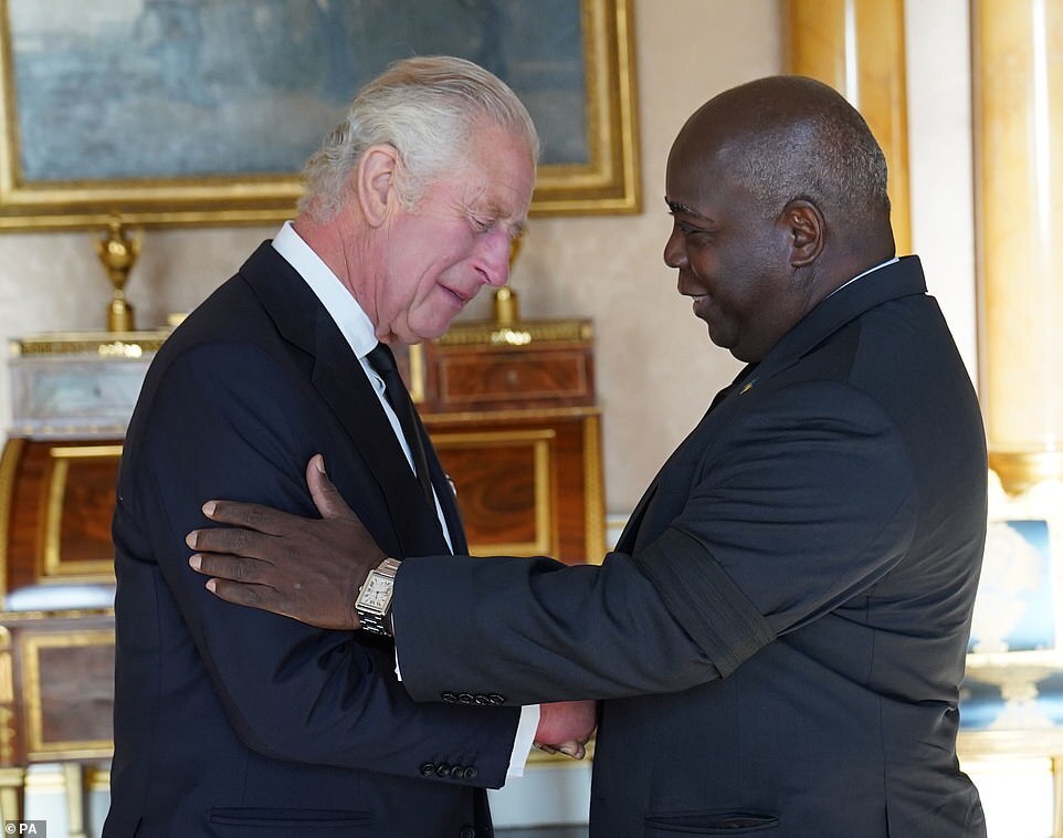 The King, who has been carrying out official duties while mourning his beloved mother, was also seen smiling and laughing with the heads of state. Pictured: The King shakes hands with the Prime Minister of Jamaica Andrew Holness