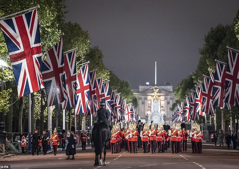 Royal guards take part in final drills along the Long Walk, as they prepare for the State Funeral of Queen Elizabeth lI, near Windsor Castle