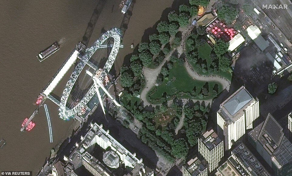 A satellite image shows queues of people waiting to pay their respects to Queen Elizabeth following her death