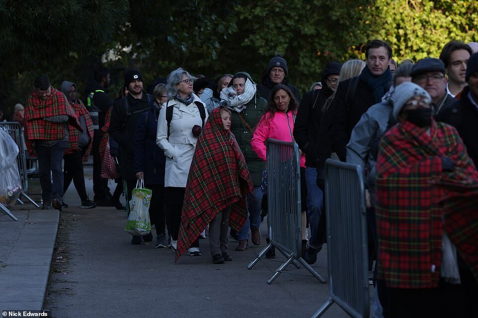Mourners queue in Southwark Park to see Queen Elizabeth II lying-in-state at the Palace of Westminster today