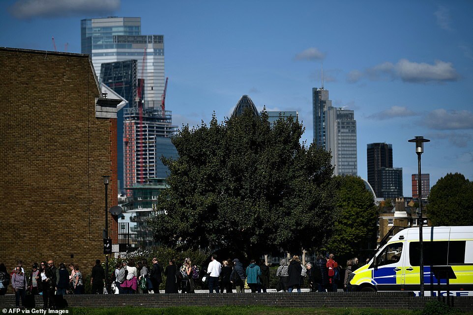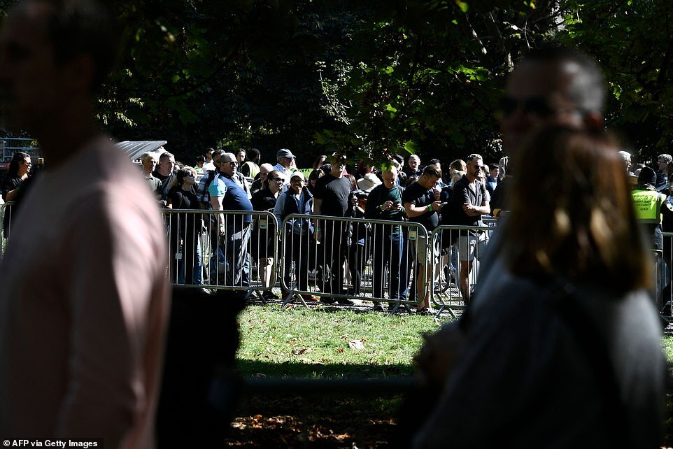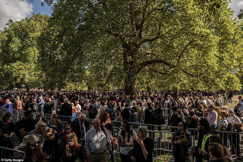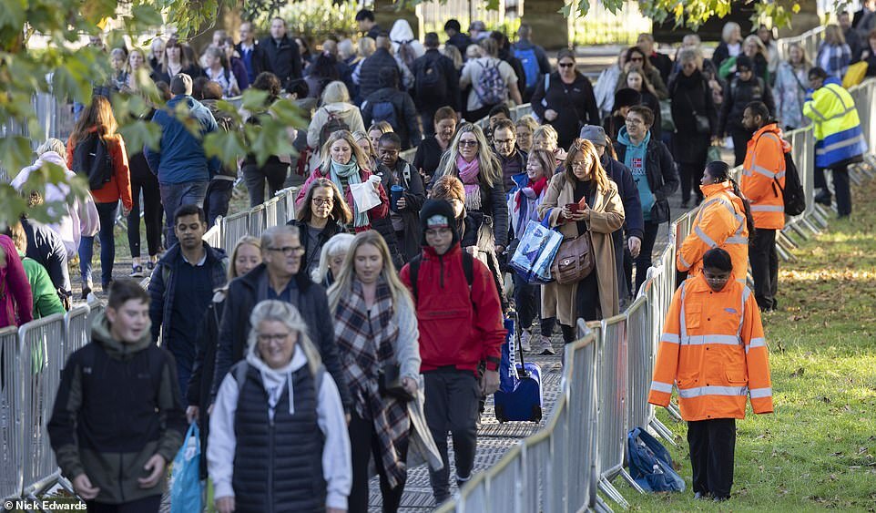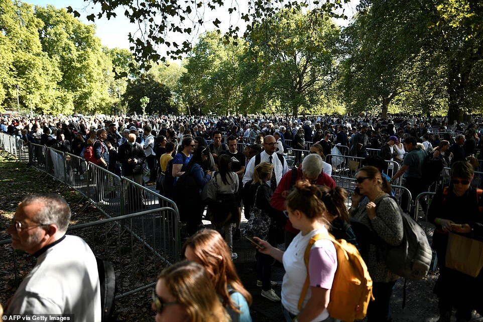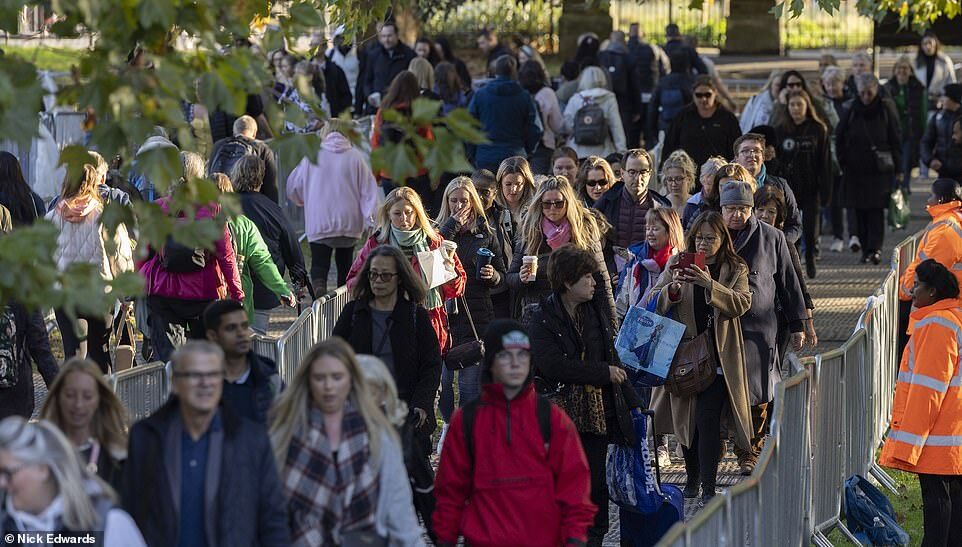 Mourners queue in Southwark Park yesterday to view the coffin of Queen Elizabeth II