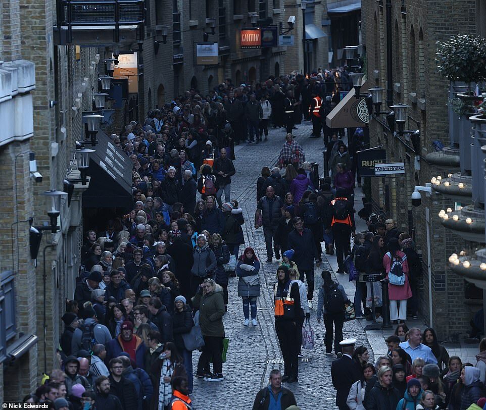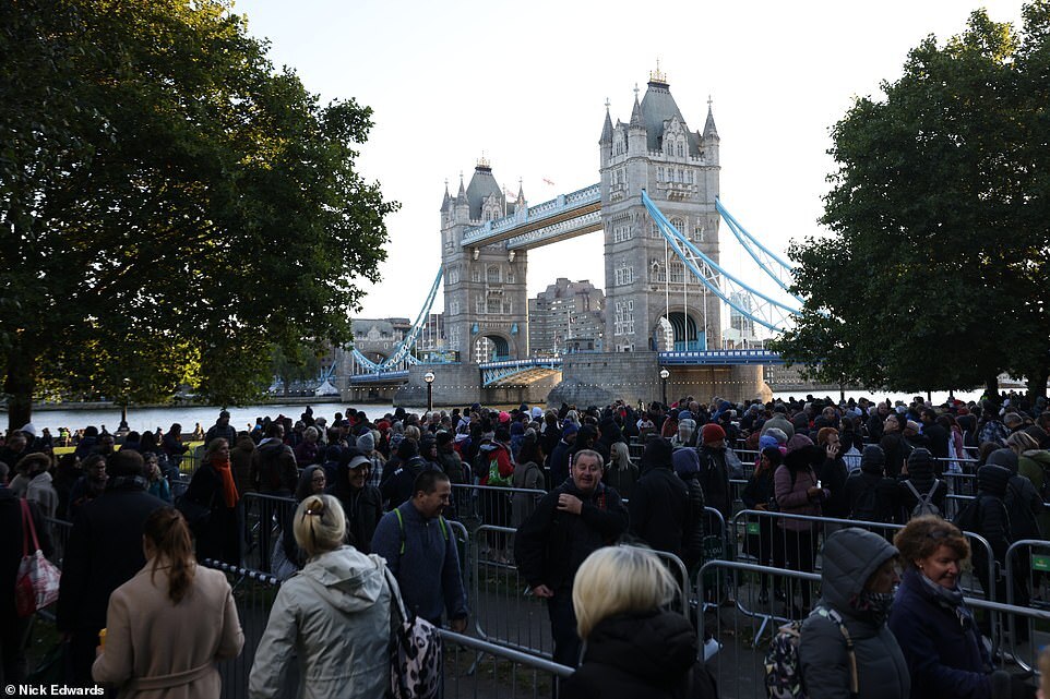 Mourners queueing at Tower Bridge in central London this morning as they wait to pay their respects to the Queen