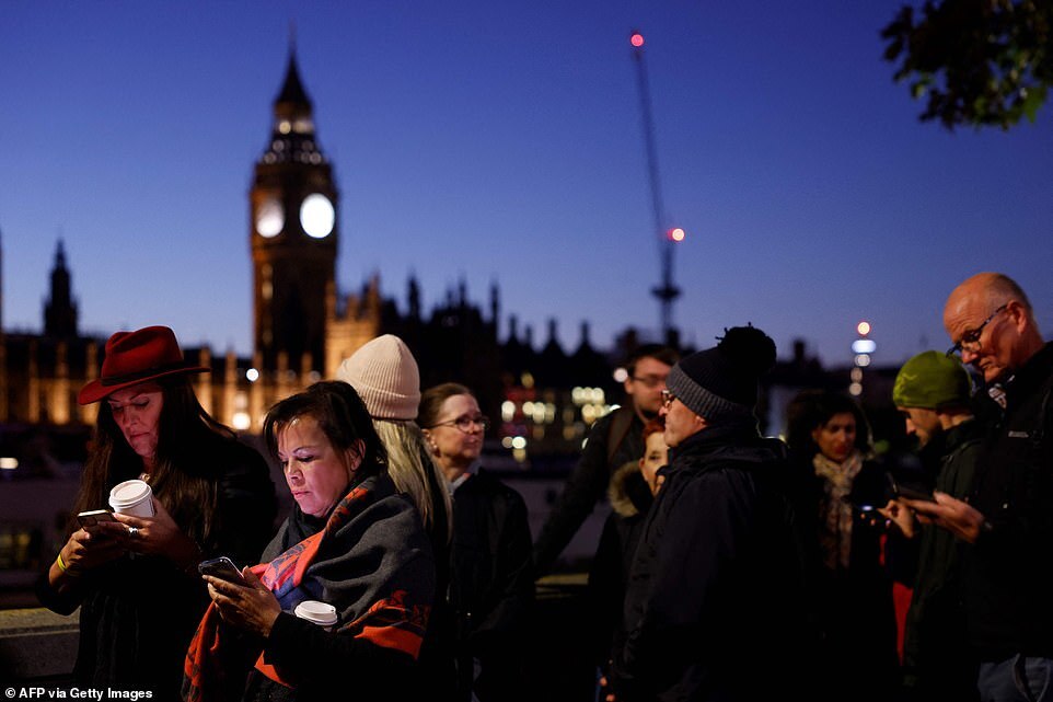 Wait times stretched to more than 25 hours overnight as thousands of mourners wrapped up so they could keep warm, the BBC even produced a tongue-in-cheek weather forecast for the queue just before 7am this morning - a crisp 7C, while other parts of the UK hit freezing.