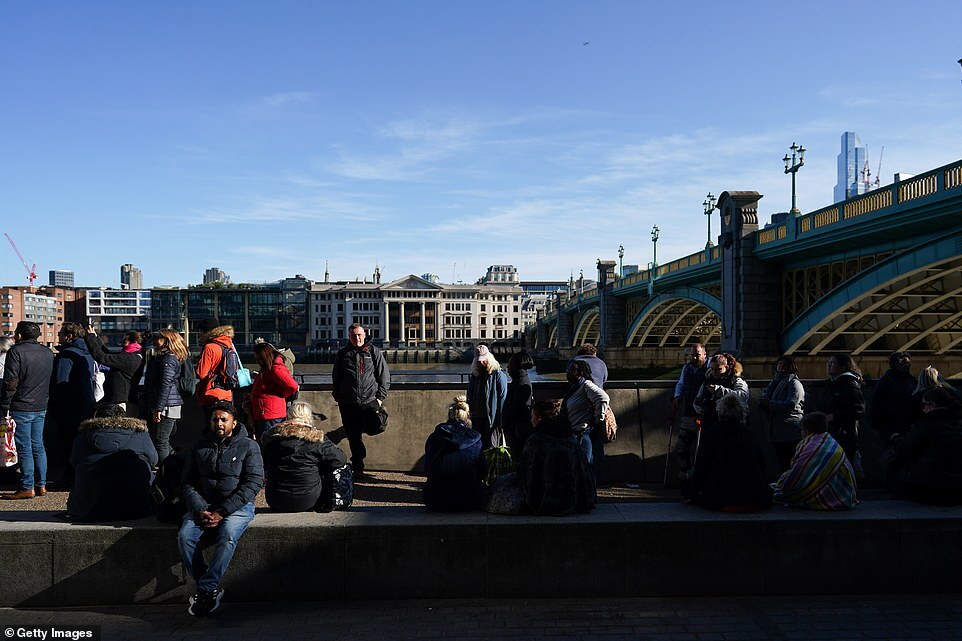 Mourners today appeared to be in good spirits as they queue along the banks of the Thames