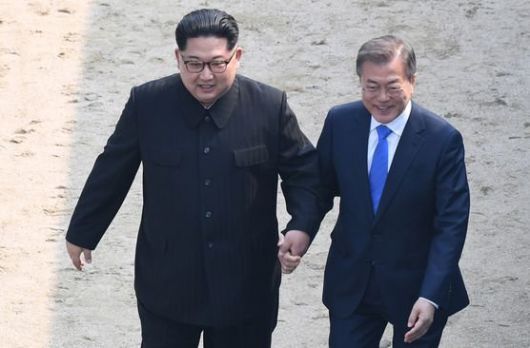2018년 4월 27일 문재인 전 대통령과 북한 김정은 국무위원장이 판문점 군사분계선 북측으로 넘어갔다가 다시 남측으로 넘어오고 있다. 연합뉴스