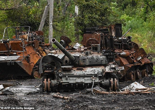 This photograph taken on September 14, 2022 shows a destroyed Russian tank and armoured personnel carriers on the outskirts of Izyum, Kharkiv Region, eastern Ukraine