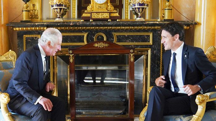 트뤼도 캐나다 총리 만난 찰스 3세 - 찰스 3세(왼쪽) 영국 국왕과 쥐스탱 트뤼도 캐나다 총리가 17일(현지 시각) 런던 버킹엄궁에서 만나 이야기를 나누고 있다. 19일 엄수되는 엘리자베스 2세 여왕의 국장(國葬)에 참석하기 위해 각국 정상과 왕족 등 국빈급 인사 500여 명이 런던으로 속속 모여들고 있다. /AP 연합뉴스