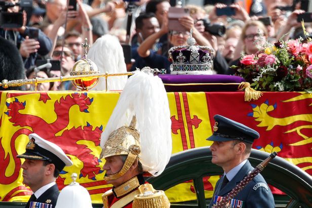 오전 11시 57분, 장례 예배의 끝을 알리는 나팔수 4명의 나팔 소리와 함께 영국 전역에서 2분간 묵념이 이어졌다. 곧이어 “신이여 왕을 보호하소서”라고 개사된 영국 국가와 애절한 백파이프 연주가 울려 퍼지고, 여왕의 관은 웨스트민스터 사원을 나와 포차에 실렸다. 군악대가 운구 행렬을 이끌고, 왕실 근위대가 호위에 나섰다. 5m 폭 8열 종대로 늘어선 해군 장병 142명이 줄 4개를 붙잡고 포차를 끌었다. 그 뒤를 찰스 3세와 윌리엄 왕세자, 해리 왕자 등 왕실 가족이 걸었다. 운구 행렬이 웨스트민스터 사원을 떠나 웰링턴 아치를 향하는 동안, 도로 양쪽에 운집한 시민들이 꽃을 던지고 두 손 모아 기도하며 여왕의 마지막 길을 배웅했다.