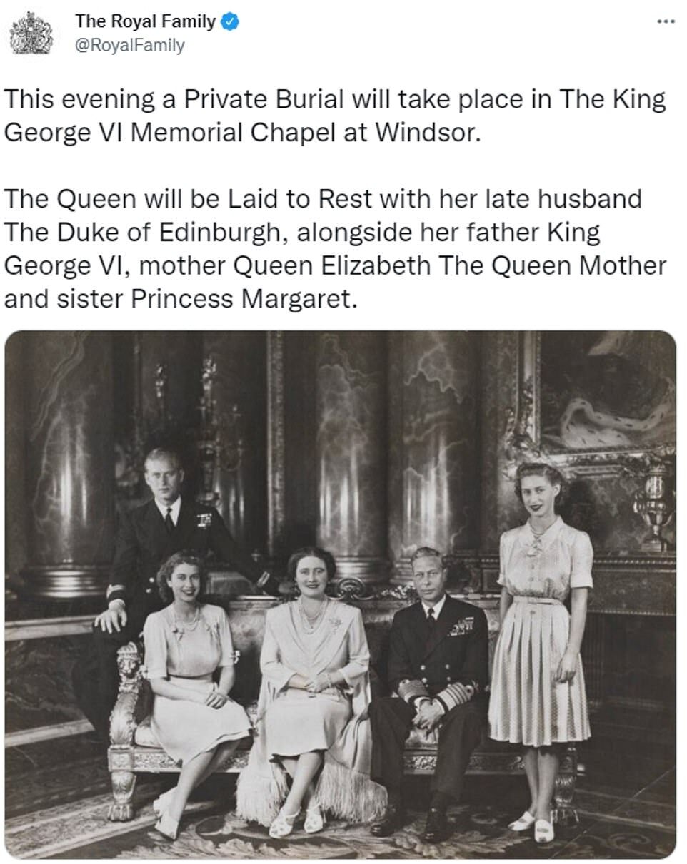 - Queen Elizabeth II was laid to rest beside her husband Prince Philip in a moving private ceremony last night
