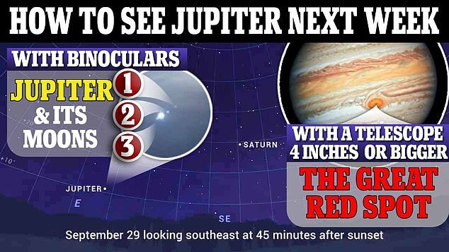 The giant planet, which will be 367 million miles from us at the closest point, is reaching its opposition next week. NASA recommends a pair of binoculars or a 4-inch telescope for the best views