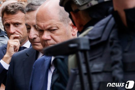 에마뉘엘 마크롱 프랑스 대통령과 마리오 드라기 이탈리아 총리 올라프 숄츠 독일 총리가 키이우 인근 이르핀의 참상을 보고 침통한 표정을 하고 있다. ⓒ AFP=뉴스1 ⓒ News1 우동명 기자