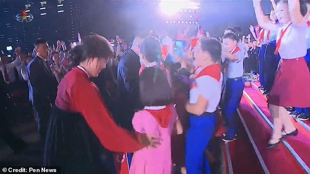And when the other children huddle around Kim Jong-un, jumping with excitement, she appears calmer, even grabbing another girl's arm to hold her back when she follows him too closely