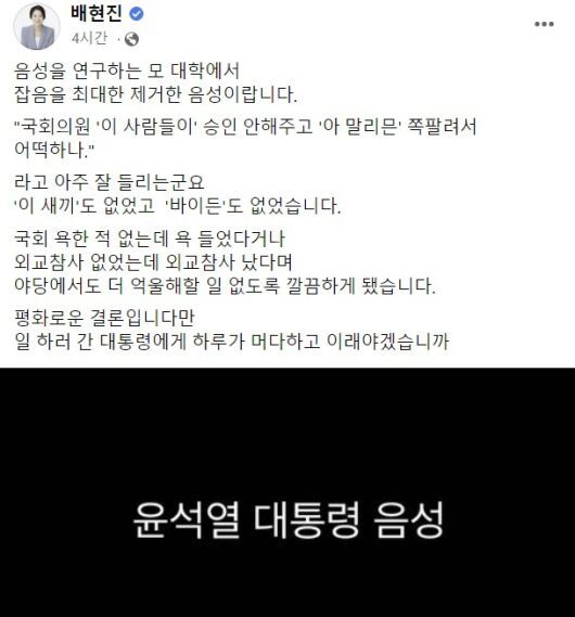 그러면서 배 의원은 “음성을 연구하는 모 대학에서 잡음을 최대한 제거한 음성”이라며 “국회의원 ‘이 사람들이’ 승인 안해주고 ‘아 말리믄’ 쪽팔려서 어떡하나, 아주 잘 들린다”라고 소개했다.