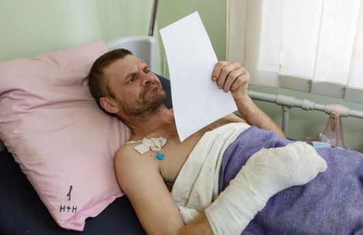 루한스크인민공화국(LPR)의 한 남성이 23일 팔을 다쳐 병원에 입원 중 러시아 병합 찬반을 묻는 주민투표지를 받아들고 있다. 타스통신=연합뉴스