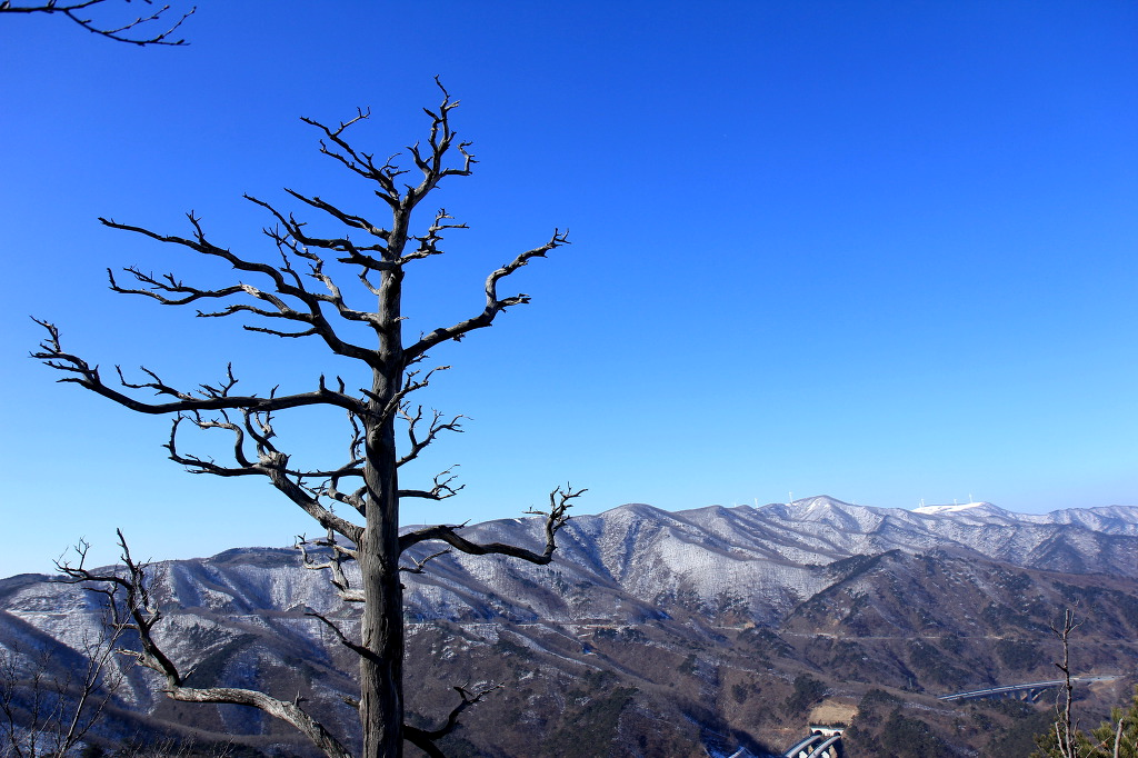 눈덮인 대관령 아흔아홉 구비 고갯길* 최좌측이 대관령마루.