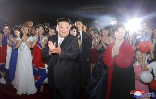 김정은 북한 국무위원장과 리설주 여사가 지난 8일 북한 정권 수립 74주년 경축행사에서 공연자들을 격려하고 있다. AP=연합뉴스