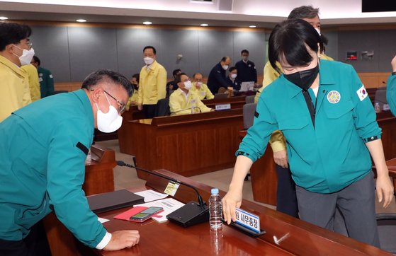 전현희 국민권익위원장이 23일 을지연습 사후 강평회의에서 유병호 감사원 사무총장 자리로 찾아가 악수를 하고 떨어진 명패를 줍고 있다. 뉴스1