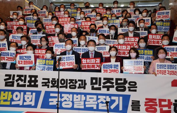 박진 외교부 장관에 대한 해임건의안이 29일 국회 본회의를 통과했다. 국민의힘 의원들이 불참을 선언하며 본회의장을 퇴장한 가운데 더불어민주당이 단독으로 처리했다.