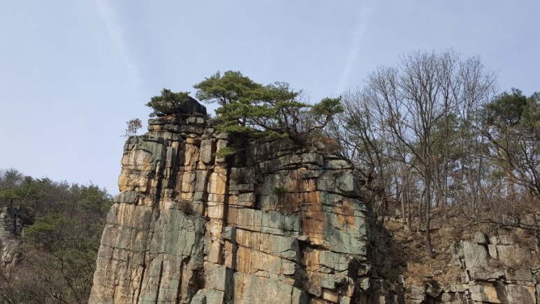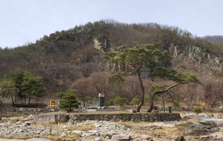 운선구곡 제6곡 사선대. 복토로 소나무가 죽고 현재 2그루가 사선대를 지킨다.