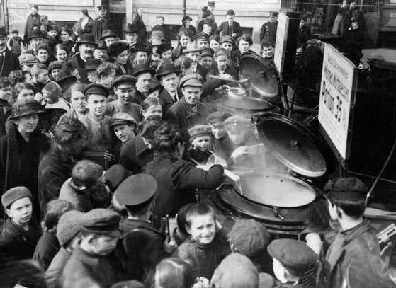 제1차 대전 당시 치킨 스프 배급을 기다리는 베를린 시민들. 당시 총력전을 벌인 독일은 봉쇄를 당해 극심한 물자 부족에 시달렸고 결국 전쟁에서 졌다. 이 때문에 나치는 국민의 동요를 우려해 총력전 언급을 삼갔다. Populus Fennica Patriam