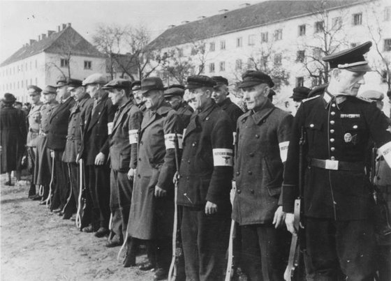 총력전 선언에 따라 동원된 노인으로 구성된 국민돌격대. 사실 이 정도라면 무모한 희생을 줄이기 위해 종전을 모색해야 하지만 나치는 끝까지 항전을 택했다. 위키피디아